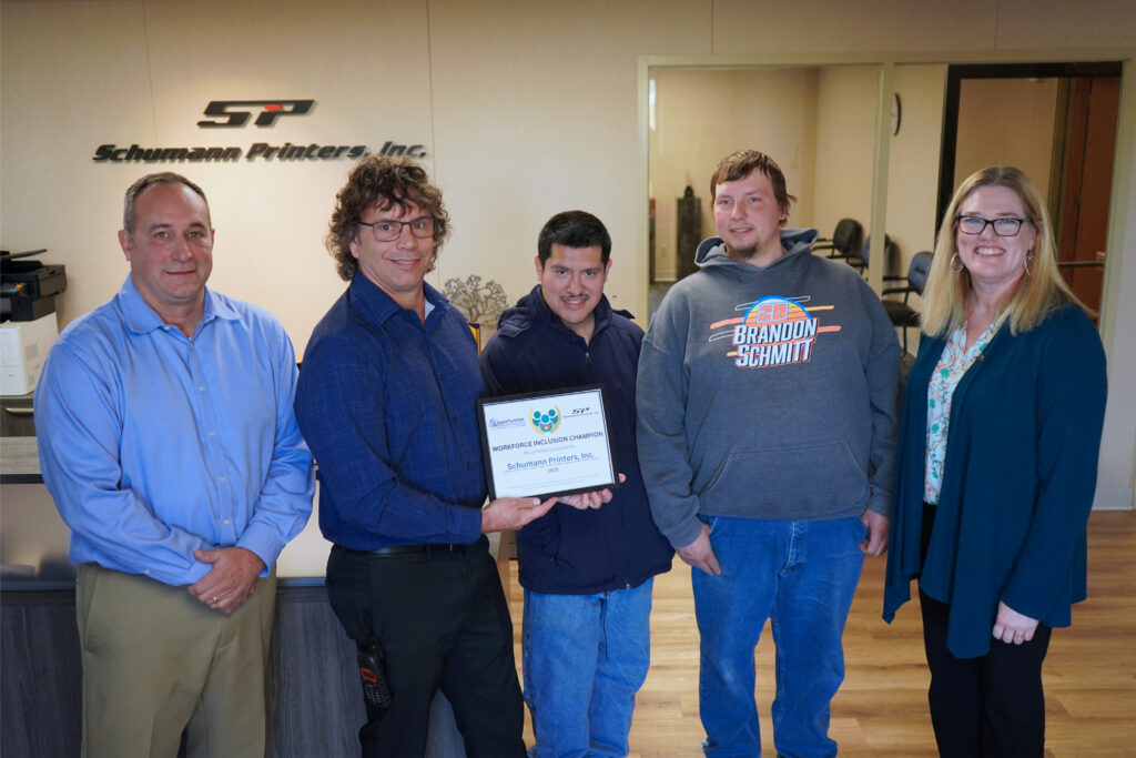 Fall River, WI — Green Valley Enterprises, a division of Opportunities, Inc., a nonprofit organization committed to empowering individuals with diverse abilities, is proud to recognize Schumann Printers, Inc. as an outstanding community partner for their ongoing commitment to inclusive employment. The company currently employs two of the organization’s talented program participants — Elias Chavaez and Austin Reinhard — who have become valued members of the team.